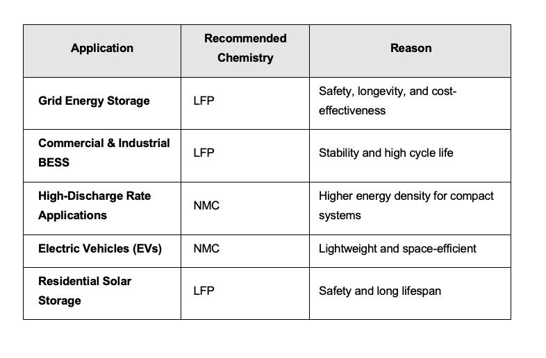 7. Best Applications for LFP vs. NMCKey Takeaway: LFP is preferred for stationary storage, while NMC is better suited for high-energy mobile applications like EVs.