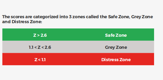 The Altman Z-score categorizes companies into three financial risk zones:
