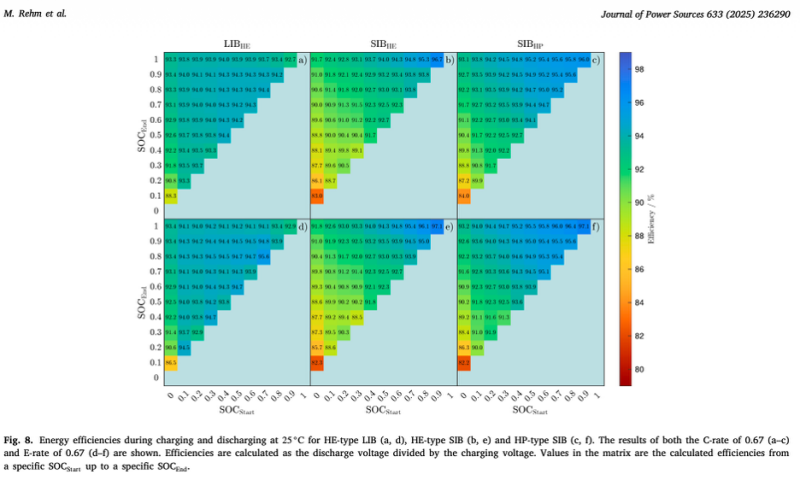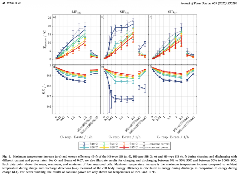 By comparison, the LFP cell retained significantly higher efficiency at 10°C across all load rates (Rehm et al., Fig. 6 d-f). The authors note that the SIBs’ “higher resistance and impedance values” and “stronger dependence on temperature” show up clearly in the efficiency data (Section 4).